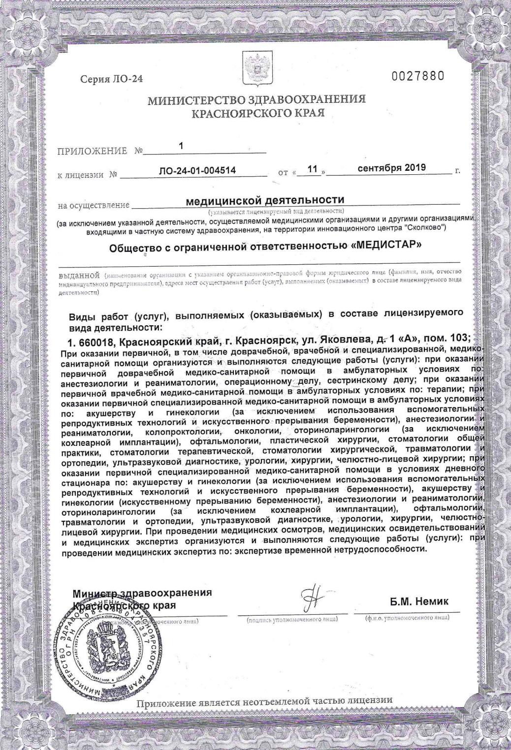 Медицинский центр «Медистар» на ул. Яковлева г. Красноярска - многопрофильная клиника, основана в 2008 году. В настоящее время в клинике работают: общие хирурги, пластические хирурги, гинекологи, урологи, травматологи-ортопеды, челюстно-лицевой хирург, стоматологи, онколог, оториноларингологи. В состав оказываемых услуг входят работы по пластической хирургии, общей хирургии, гинекологии, травматологии-ортопедии, стоматологии, челюстно-лицевой хирургии, урологии, оториноларингологии, онкологии. Мы оказываем медицинскую помощь по 11 направлениям. Клиника оснащена современным оборудованием: оборудованием для проведения артроскопических операций, лапароскопических операции в хирургии и гинекологии, гистероскопических операций, апаратом УЗИ последнего поколения и многим другим оборудованием, без которого невозможно провести точную, своевременную диагностику. В нашей клинике ведут приемы и проводят оперативное лечение, профессора, кандидаты наук, специалисты высшей квалификационной категории. Все врачи с большим опытом работы в различных крупных медицинских учреждениях, постоянно повышающие квалификацию на российских и международных медицинских симпозиумах и конференциях.