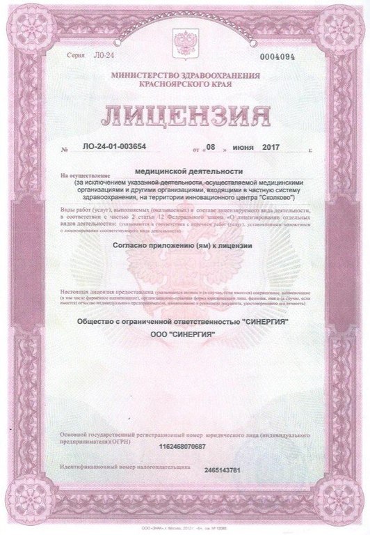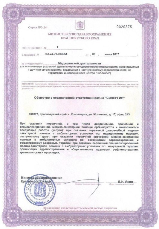 Клиника «Синергия» на ул. Молокова г. Красноярска — это клиника неврологии и мануальной медицины. Наша специализация – диагностика, консервативное лечение и профилактика широкого спектра заболеваний периферической нервной системы, опорно-двигательного аппарата и внутренних органов. Мы открылись в 2017 года на основании действующих законов Российской Федерации, согласно приказам Министерства Здравоохранения Российской Федерации и в строгом соответствии с официальной государственной лицензией. В отличие от огромных медицинских центров – этих «супермаркетов медицины» - у нас нет длинных коридоров, суеты и очередей. Мы не запускаем пациента «по кругу» от одного платного специалиста к другому. «Синергия» - это современная клиника, в которой ведут прием неврологии и мануальные терапевты. Благодаря удобному расположению и спокойной обстановке, мы имеем возможность уделять каждому пациенту столько времени, сколько потребуется для решения его проблемы. Вы будете чувствовать себя комфортно и во время посещения клиники, и во время лечения. В своей работе мы ориентируемся на высокий уровень медицинских стандартов и профессионализма. Практикуемый в клинике «Синергия» строгий научный подход и передовые достижения, используемых методов терапии надёжно устраняют и саму болезнь, и её причину. Мы практикуем передовой подход в мануальной медицине.